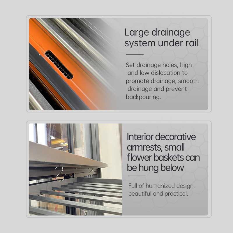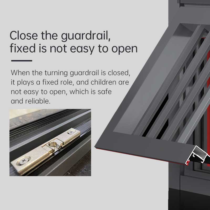 Хаоиа алуминијумски Иуњи серије 93 2 колосека сломљени мост клизни прозори користе четворостране двослојне шифроване врхове да ефикасно спречавају прашину, ветар, песак и комарце. Брзе заптивне траке од ЕПДМ за шине и ЕПДМ брзе меке и тврде коекструдиране интегрисане траке од пене за савијање обезбеђују заптивање и непропусност прозора. Затворена ограда прозора је фиксирана и тешко се отвара, а преклопна ограда има ефекат фиксирања када је затворена, пружајући сигурну и поуздану заштиту. Истовремено, заштитна ограда има функцију сушења, пружајући корисницима већу флексибилност.
