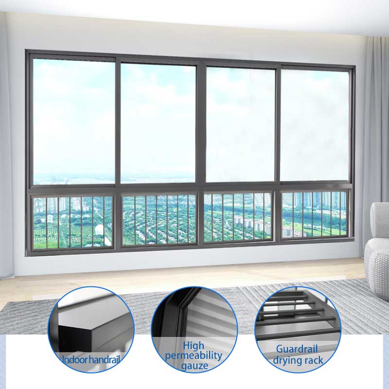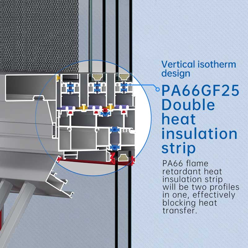 Дизајн изотермне површине карактерише стандардна најлонска топлотноизолациона трака, која појачава звучну изолацију и топлотну изолацију. Дизајн прозорског крила 2-у-1 спречава одвајање и судар, обезбеђујући дугорочну издржљивост крила и рама. Сигурносне карактеристике укључују механизме против пада и одвајања, који осигуравају сигурност структуре прозора.