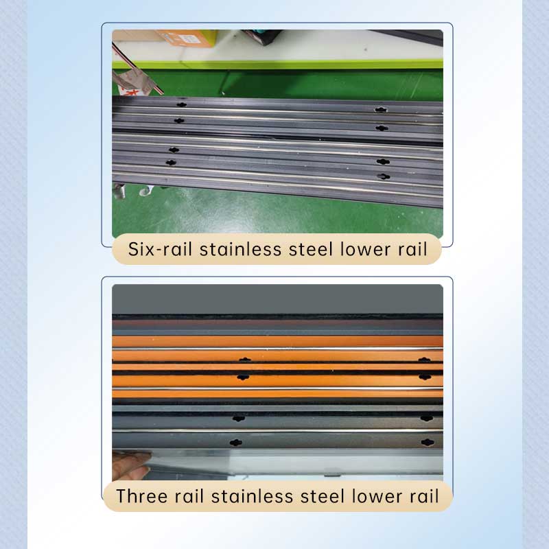Прозори имају дворедни дизајн ременице, осигуравајући глатко клизање и побољшану носивост. Гусјенице обложене нерђајућим челиком, дебљине 3,0 за доњу шину, олакшавају бешавно и тихо клизање. Додатак ивице која блокира воду повећава отпорност на воду и спречава повратни ток.